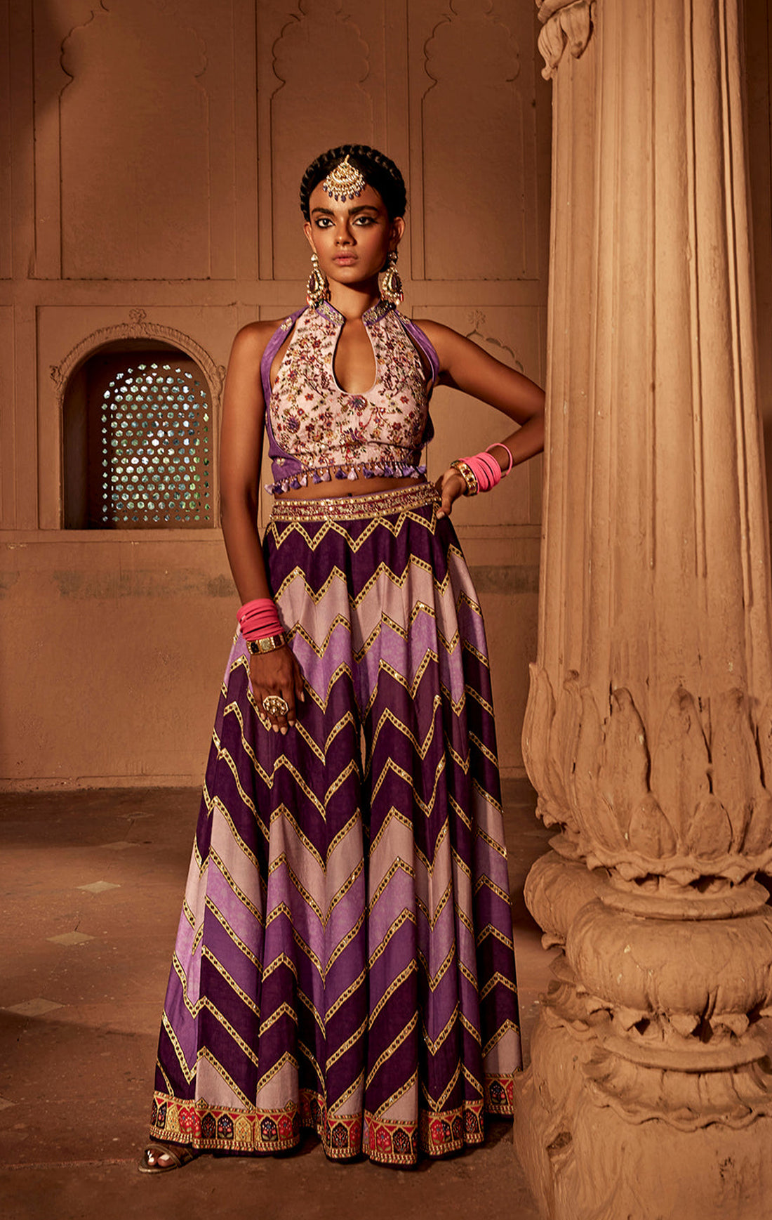 For a modern twist on traditional bridal attire, a bridal sharara suits with a crop top is a chic choice. This crop top with sharara pairs a stylish, shorter top with wide, flowy sharara pants, creating a balanced look that’s both elegant and contemporary. Perfect for brides wanting a lighter, trendy outfit for pre-wedding events, this style adds charm while staying rooted in tradition. The crop top and sharara combination brings out the bride’s personality and keeps her comfortable, allowing her to enjoy every moment of her big day without compromising on style or elegance.