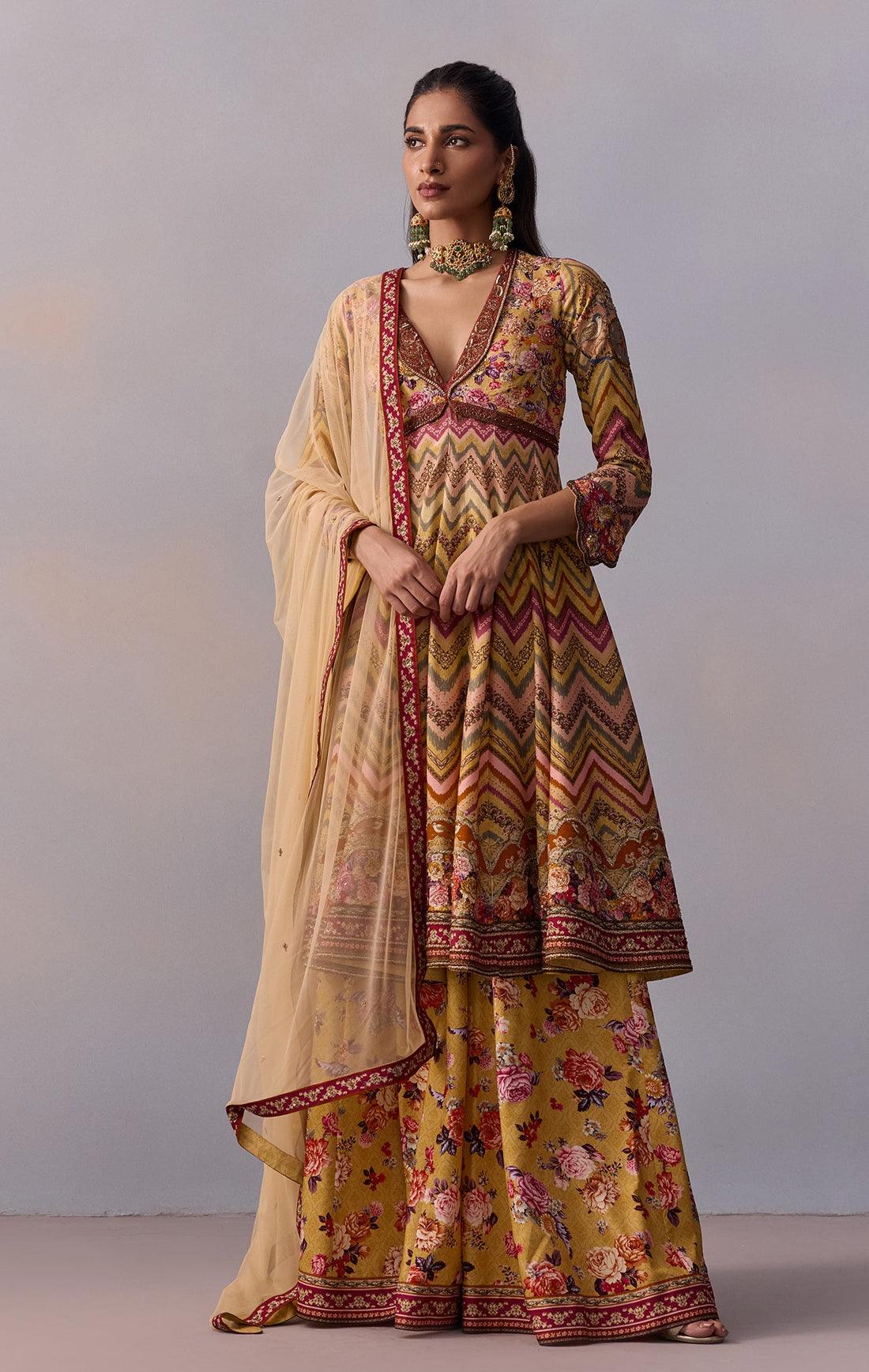 Ghararas are a unique and opulent outfit for Lohri celebrations, perfect for modern women looking to make a statement. With their wide-leg trousers and ornate detailing, ghararas offer a blend of traditional charm and contemporary style. A gharara set for Lohri is ideal for evening gatherings with family and friends, especially if you're attending a grand celebration. The luxurious fabrics and intricate embroidery elevate the outfit, making it perfect for the festive spirit of Lohri. These Lohri dresses ensure you stay comfortable and elegant while enjoying the warmth and togetherness of the festival.