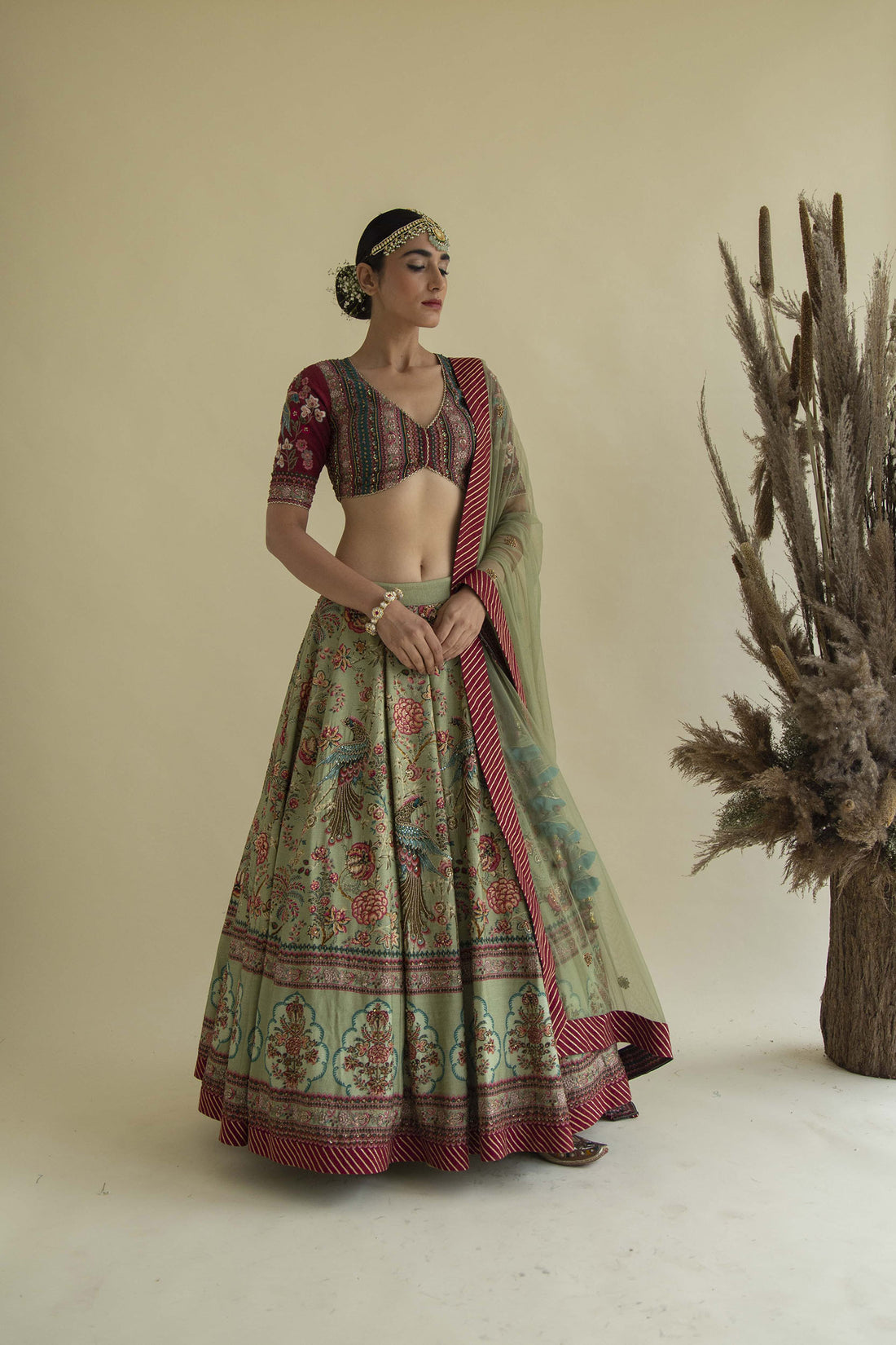 Mint green haldi lehengas are a refreshing and unconventional option for brides who want to stand out. This calming shade brings a modern edge to traditional ceremonies, offering a unique alternative to brighter colours. Brides can embrace contemporary styles with mint green lehengas featuring intricate chikankari work or subtle embellishments. Pair this green lehenga with silver jewellery or pastel accents for a sophisticated and refreshing bridal outfit.