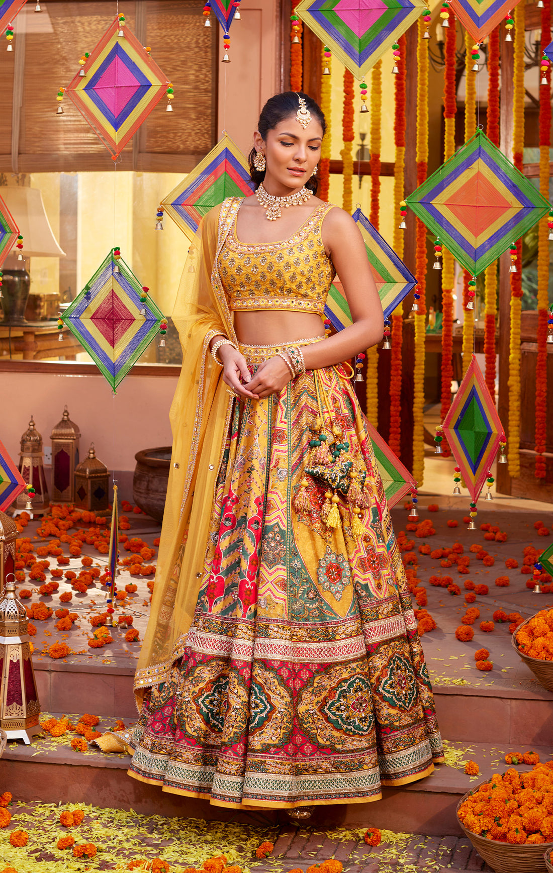 For a traditional yet stylish look, go for a gota patti or mirror work haldi lehenga. Brides seeking something modern can opt for designs with asymmetrical hemlines or cape-styled haldi lehengas for a unique touch. Pairing the lehenga with a crop top or a trendy blouse creates a fresh and contemporary outfit.