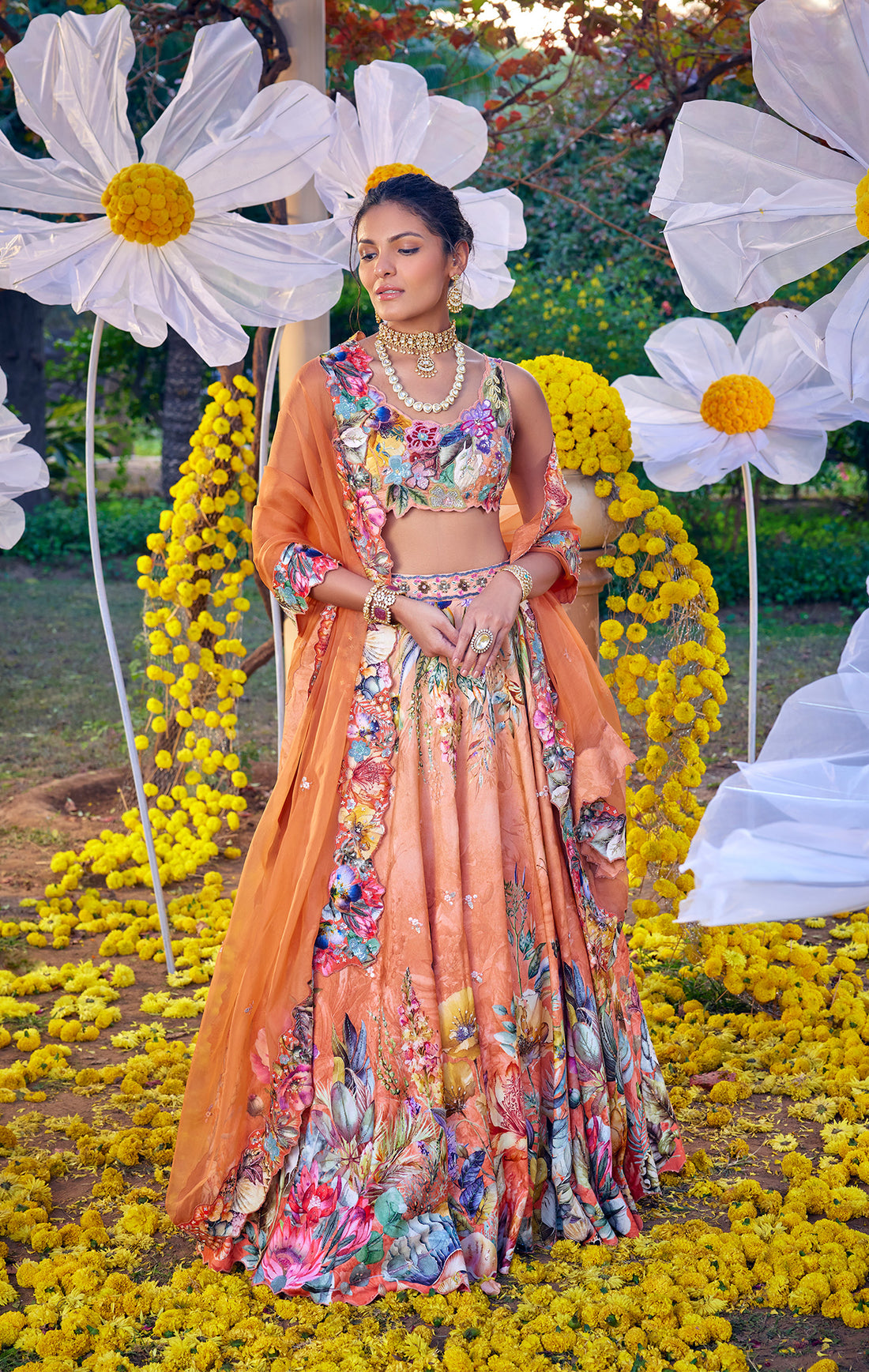 Bright orange floral lehengas are an exciting choice for brides who want a bold, festive vibe. The striking hue is ideal for daytime celebrations, adding warmth and energy to the occasion. Contemporary styles in orange, such as asymmetrical cuts or layered skirts, offer a modern twist while staying rooted in tradition. Pair your orange lehenga for haldi with contrasting dupattas or intricate embroidery for a truly standout look.