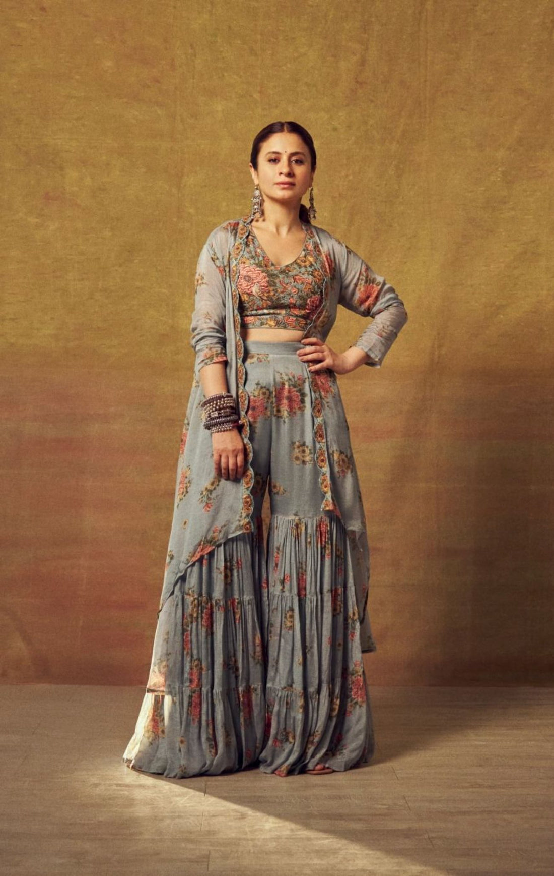 A Floral Printed Gharara Set offers a traditional yet trendy option for Raksha Bandhan outfits. Enhance your look with a statement necklace or layered chains to draw attention to the outfit's detailed embroidery. Choose bangles or a bracelet stack that complements the colors of your Gharara for a cohesive and stylish look. This ensemble combines elegance with a modern twist, ensuring you stand out during the Raksha Bandhan celebrations.