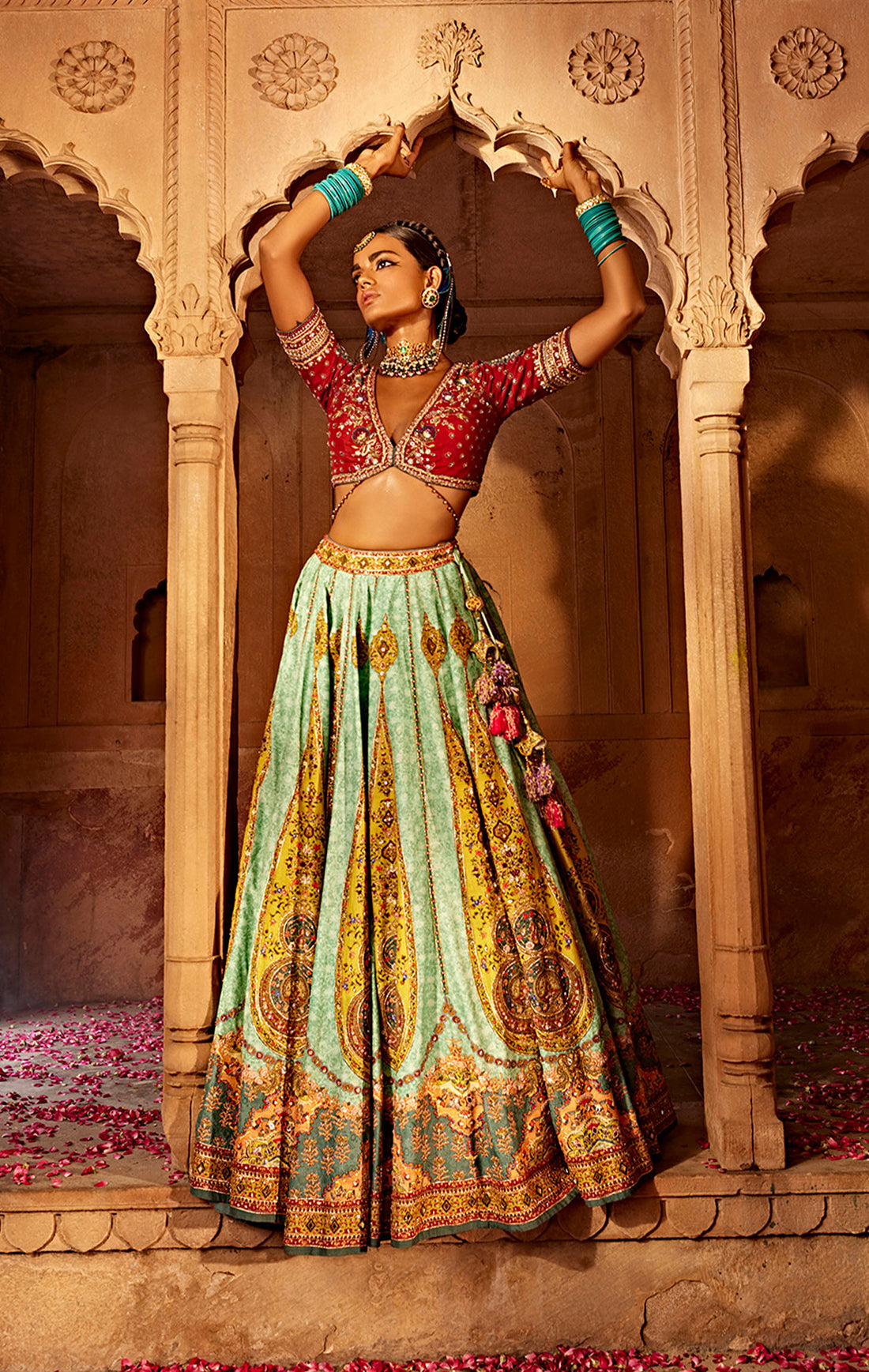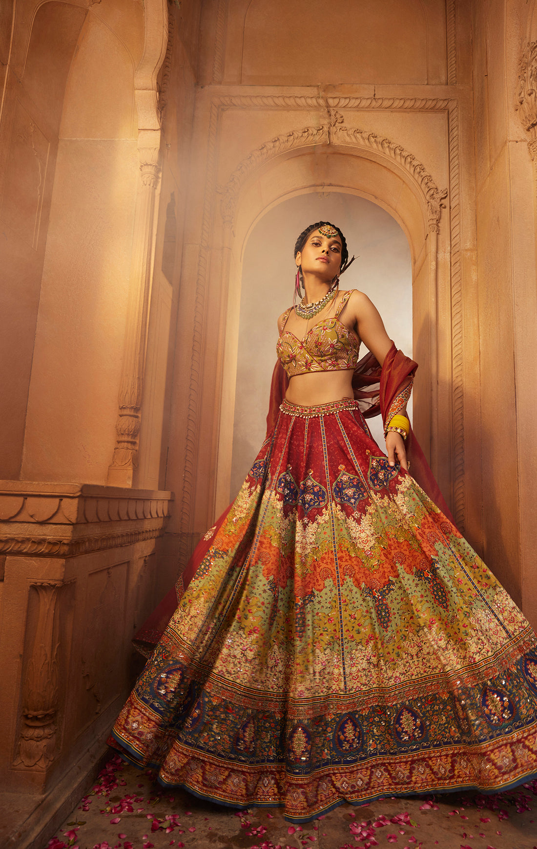 For brides who like to blend traditional with modern styles, a floral printed lehengas that has floral prints is a great choice. Floral designs add a touch of freshness and youthfulness to the outfit, making the red lehenga for wedding stand out even more. This type of lehenga is perfect for outdoor weddings or daytime events, where the floral patterns can be appreciated in natural light. A red lehenga for wedding with floral prints also gives the bride a unique and trendy look, while still keeping the elegance and charm of a traditional red lehenga.
