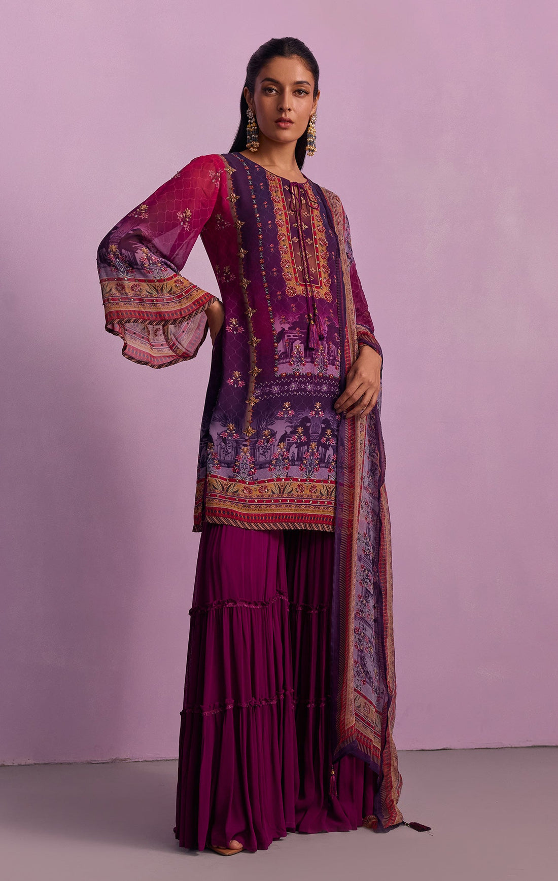 Angrakha sets are an exquisite addition to your festive wardrobe, blending cultural heritage with modern design. Their overlapping style, adorned with tassels or embroidery, adds a distinctive touch to your look. Floral-printed angrakhas are versatile Ramadan special dresses, perfect for family prayers or evening celebrations. Pair them with statement jhumkas, a sleek clutch, and embroidered mojris for a regal and complete appearance during Ramadan.